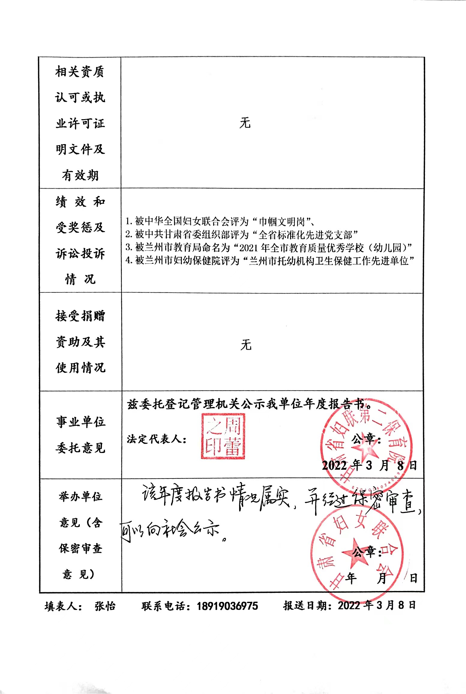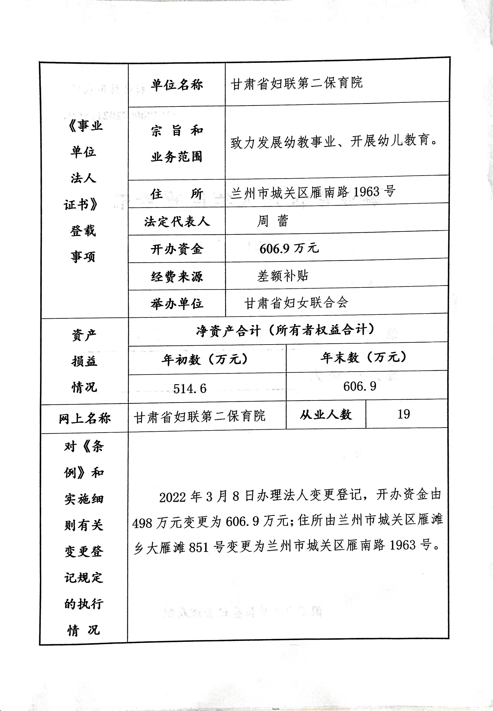 甘肃省妇联第二保育院事业单位法人报告书