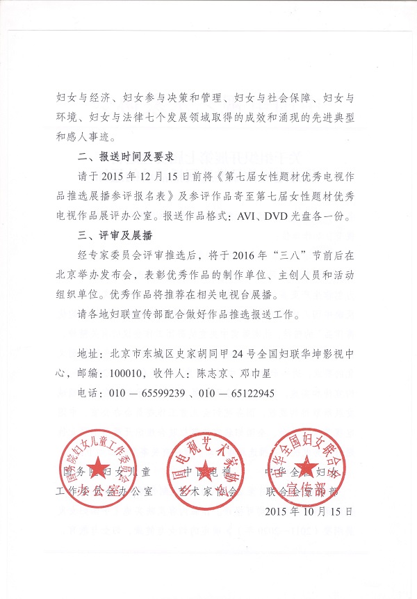 为认真贯彻习近平总书记在文艺工作座谈会上提出的“努力创作生产更多传播当代中国价值理念、体现中华文化精神、反映中国人审美追求,思想性、艺术性、观赏性有机统一的优秀作品”精神,扎实落实中央党的群团工作会议有关精神,近日,国务院妇女儿童工作委员会办公室、中国电视艺术家协会、全国妇联宣传部联合组织开展了第七届女性题材优秀电视作品推选展播活动。现将《关于组织开展第七届女性题材优秀电视作品推选展播活动的通知》转发给你们,请按通知要求认真组织申报。 附件:《关于开展第七届女性题材优秀电视作品推选展播活动的通知》 甘肃省妇联2015年11月4日