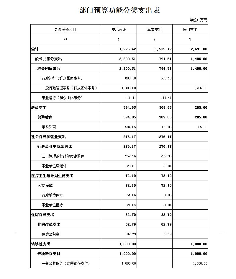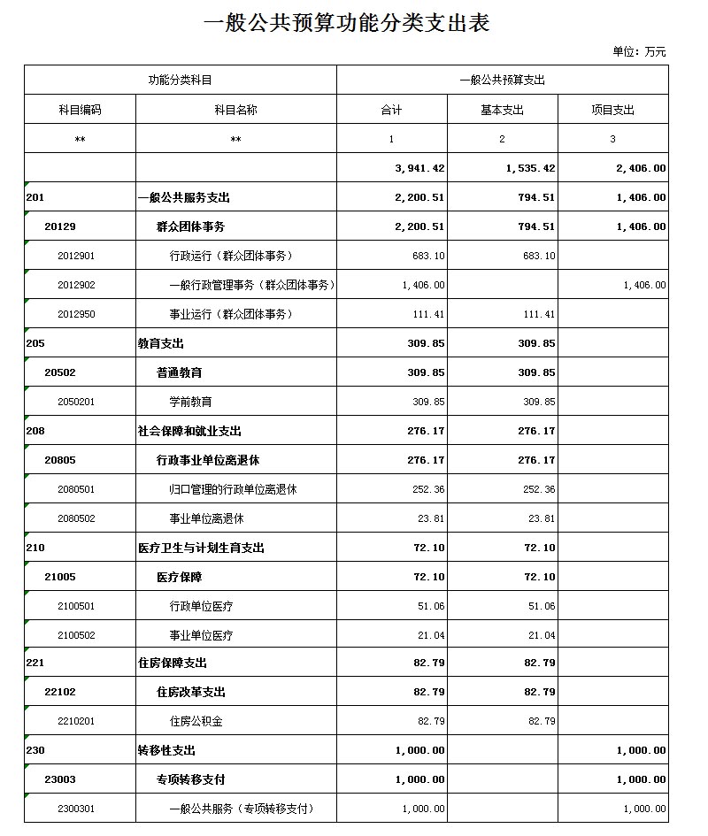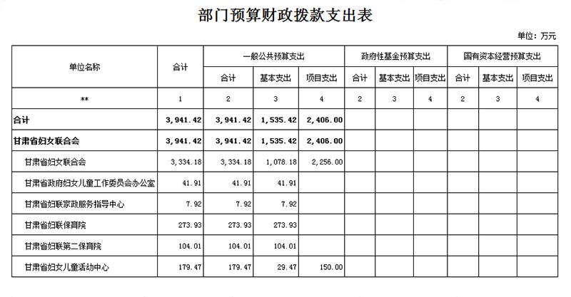 2016年财政厅省级部门预算批复我单位财政资金共计3941.42万元,其中:一般公共服务支出2200.51万元,教育支出309.85万元,社会保障和就业支出276.17万元,医疗卫生与计划生育支出72.10万元,住房保障支出82.79万元,转移性支出1000万元。
