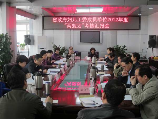 为了更好地推动我省妇女儿童发展规划的实施,3月12—13日,省政府妇儿工委召开省直成员单位2012年度实施“两规划”考核汇报会。省发展改革委等31个成员单位分三组对实施妇女儿童发展规划目标责任书完成情况进行了汇报。为做好考核工作,省政府妇儿工委成立了由省政府妇儿工委办公室主任、省妇联副主席朱玉兰任组长,省卫生厅、省统计局、省政府妇儿工委办公室等单位有关人员组成的考核组??己俗楦莞鞒稍钡ノ煌瓿赡勘暝鹑问榍榭龌惚?,结合各单位自评打分进行量化评价,提出了考核评定意见,提交省政府妇儿工委研究确定。朱玉兰副主席主持汇报会。