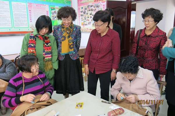 穿针引线工作室是该社区妇女从事手工缝制和编织的地方。居委会妇联与女企业家协会会员所属燕莎服装厂合作,由厂家提供原料和技术指导,社区妇女进行手工缝制,让有时间有能力的妇女在闲暇之余适当增加经济收入。工作室里,一位老人戴着老花镜,正在缝扣子。交谈中了解到,老人83岁,身体硬朗,居委会妇联根据老人意愿安排一些力所能及的活给她,每月可以有一千多元的收入,老人对此非常满足。