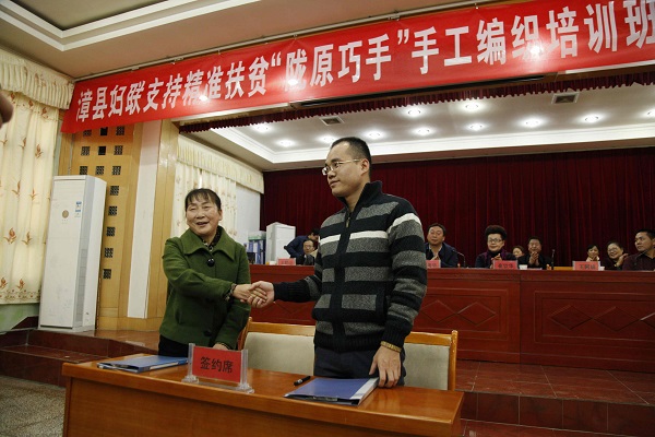 在开班及签约仪式上,专程到漳县送技术送资金的北京谨滔文化公司和北京三宝工艺品厂,与漳县贵清山妇女手工编织协会签定了40万元的产品订购协议,并现场收购了价值1万元的妇女手工制品?!吨泄九吩又旧缍降纪醢⒚谩⒈本┓把г航淌谕跞荷皆谇捌诘餮械幕∩?,对现阶段初级陇原巧手产品如何营销提供了可借鉴和操作的思路,并表示下一步将立足漳县文化传统和手工制作特点,着力挖掘、研发、设计、包装、策划,以实用时尚的新品提升档次,以坚持不懈的品牌推介拓展市场。