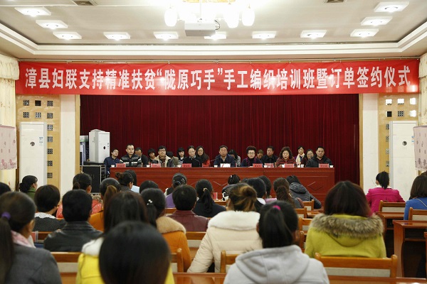 在全国妇女手工编织协会、爱心单位和爱心企业的大力支持下,近日,漳县妇联举办支持精准扶贫“陇原巧手”手工编织培训班暨订单签约仪式,130名贫困村妇代会主任、妇女骨干参加了培训。中直机关工委群工部副部长崔钦华,省妇联副巡视员、办公室主任崔海华出席开班及签约仪式。