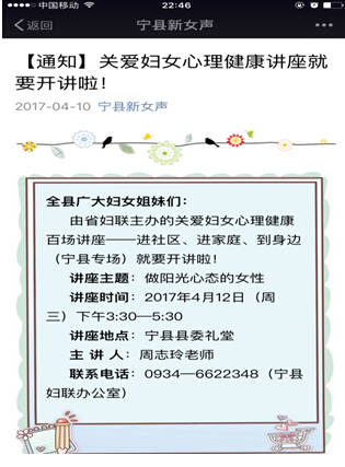 又是人间四月天,春风和煦,四野清明。为引导广大妇女树立健康向上的良好心态,营造温暖的家庭氛围,推动平安家庭、平安社会创建深入开展。为期3天的省妇联关爱妇女心理健康百场讲座-进社区、进家庭、到身边走进庆阳专场讲座4月14日上午在西峰区完美收官?;疃氏殖鲆韵录父鎏氐?,一起去看看吧: