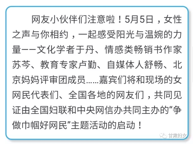 北京师范大学教授于丹讲授首堂巾帼好网民系列网络公开课,畅销书作家苏芩分享与读者之间的动人故事,“知心姐姐”卢勤传授教育专家独门“秘笈”,自带表情包的网红“大妈”舒畅讲述对热点现象的独到见解,为孩子“护航”的“巾帼网络卫士”志愿者真情吐露年轻妈妈的心声……是不是信息量爆棚?除了亲临现场来感受盛况之外,网友小伙伴们更可以通过我们开通的直播渠道实时收看哦!