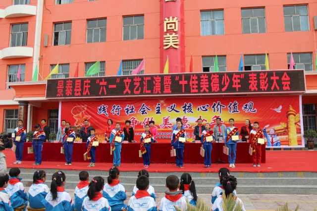 一是开展“学习雷锋,争做美德少年”主题实践活动?!傲弧逼诩洌匚?、文明办、教育局、团县委、县妇联、关工委联合举办景泰县庆“六一”文艺汇演暨“十佳美德少年”表彰大会,激励广大未成年人崇尚先进、见贤思齐,传承和弘扬传统美德??埂坝蚀⒁斜比刂行⊙凹猩缁峒壑倒郏仓手泄巍弊魑拇笕疃?,选出高中组、初中组、小学组一、二、三等奖及优秀组织奖260名学生进行表彰奖励。通过表彰活动,引导全县各中小学和广大师生以先进为榜样,组织实施24字核心价值观“人知人晓、人信人守、人行人动”行动,培养“立志向、有梦想、爱学习、爱劳动、爱祖国”的优秀接班人,进一步加强广大青少年社会主义核心价值观教育。各学校充分利用校园网络、广播、校报??⒑诎灞?、阅报栏等途径,广泛宣传“十佳美德少年”的先进事迹,营造了学习美德少年、崇尚美德少年、争当美德少年的浓厚氛围。