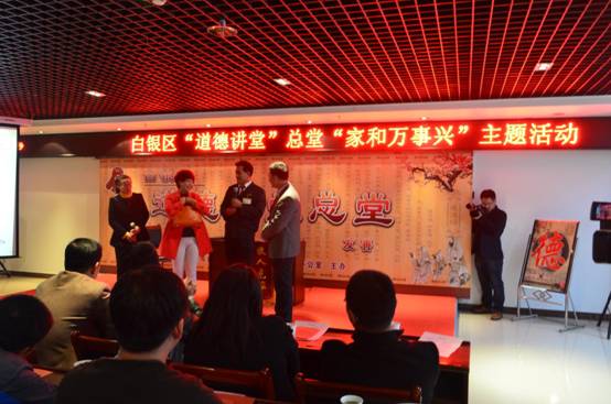 本次道德讲堂活动分为“问自己、唱歌曲、学模范、诵经典、悟字理、发善心、行善事、敬道德、送吉祥” 9个环节。在深入了解了家庭美德的内涵之后,活动进入了道德讲堂的第一个环节“问自己”,在场的每位人员“三问”自己:在家中是否做到尊老爱幼?对父母长辈是否做到孝顺?作为父母是否做到关爱陪伴子女,倾听他们的心声?在反思中践行孝道,传承孝道?!俺枨被方冢磺都液屯蚴滦恕反镒胖谢褡寮彝ズ湍赖拿赖?。“学模范”讲述了白银区武川乡独山村关秀珍和李珍秀两位孝老爱亲的感人事迹,以身边“看得见、学得到”的“凡人善举”展现了孝亲敬老的可贵品质?!八芯洹被方?,与会人员共同诵读了出自《孟子》的经典名句“老吾老,以及人之老;幼吾幼,以及人之幼”,通过重温这一经典让大家践行孝道。“存好心,做好事,当好人,有好报”小品《的哥的爱心》将“行善事”这一环节推向了高潮。