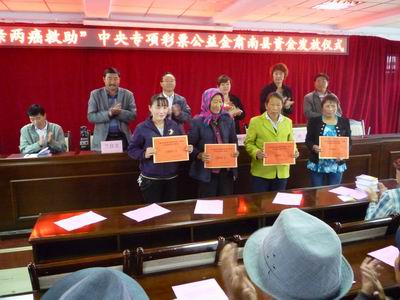 “贫困母亲两癌救助专项基金”是全国妇联为解决贫困妇女治疗难题而设立的救助项目,此项目自2011年5月启动以来,肃南县妇联通过调查、摸底、申报、审核,将符合条件的患病妇女向省妇联进行了申报。省妇联通过进一步的审核,11名患宫颈癌、乳腺癌的我县贫困妇女成为全省首批救助对象。目前,11名患病的贫困母亲已分别领到1万元的救助金。