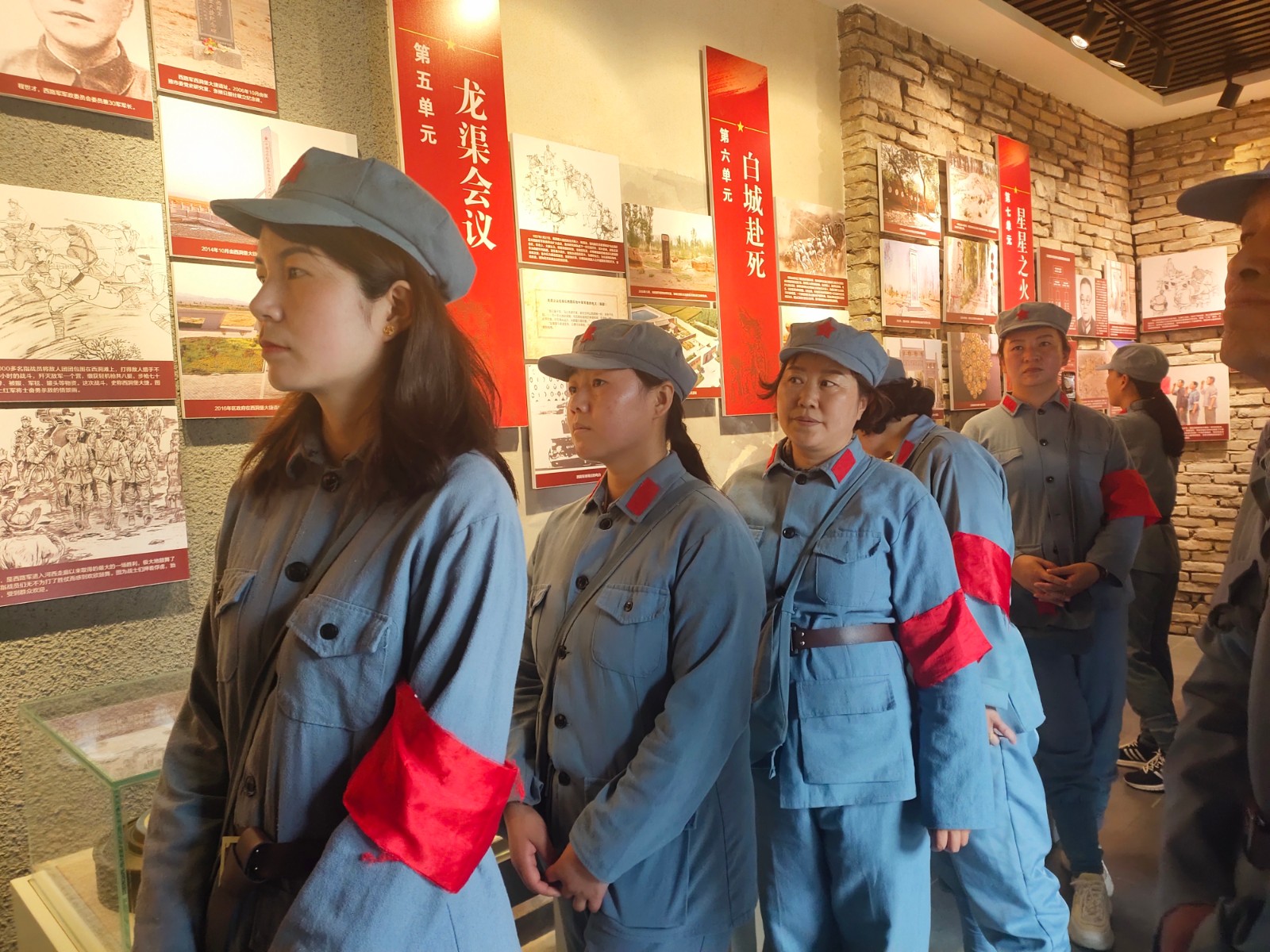 在龙渠烈士陵园,全体女干部身着红军服向烈士墓碑敬献花篮,瞻仰烈士纪念碑,详细了解中国工农红军西路军将士征战河西的悲壮岁月和陈氏三代接力守护烈士墓的感人事迹。怀着对革命先烈无比崇敬的心情,大家沿着红西路军将士在龙渠乡征战的道路,高唱革命歌曲。