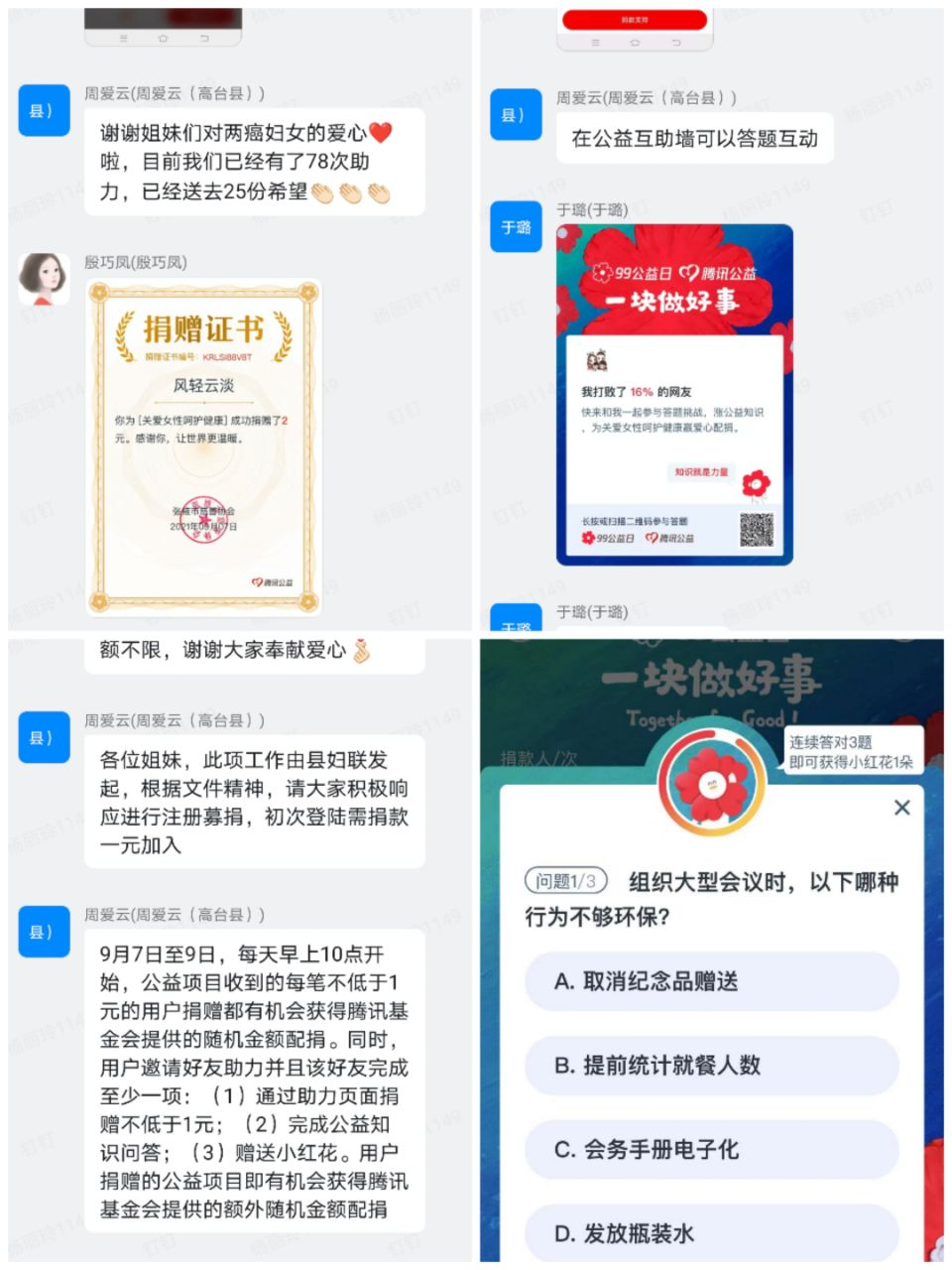 为弘扬公益美德,努力倡导向上向善的社会风尚,近日,高台县财政系统妇联开展了以“99公益日,一起做好事”为主题的网络募捐活动。